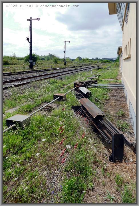 Ja, und dann sehen wir die neben dem mechanischen Stellwerk Poste 1 aufgereihten vier Formsignale deutscher Bauart J, K, L und H mit jeweils unterschiedlichen Masten, wobei der