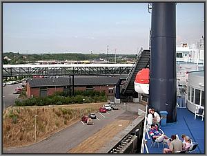Die Passagiere, Lastwagen, PKW und auch EC 34 haben im Fährschiff in Rodby Platz gefunden und gleich wird man hier ablegen, um in dreiviertelstündlicher Fahrt