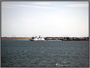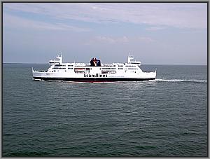 Mitten auf dem Wasser begegnet uns das Fährschiff "Prinsesse Benedikte" und kurz vor dem Ziel Putgarden sticht ein weiteres Boot gerade in See.