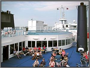 den Fehmarnbelt zu überwinden. Niemand darf im Zug im Unterdeck zwischen den Straßenfahrzeugen bleiben, und so treffen sich die Reisenden im Restaurant und bei schönem Wetter