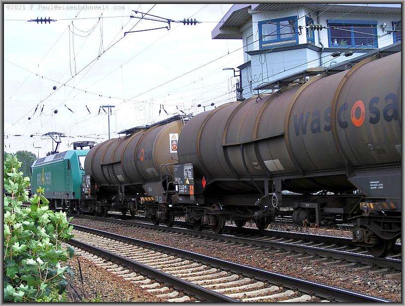 Eine lange Wagenschlange mit Chemieprodukten (Von deren Gefährlichkeit ich lieber nichts wissen will!) rumpelt am Stellwerk "Gnf" vorbei. |