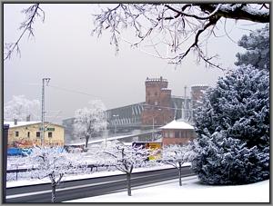 420 294 darf gerade "eintreten". Und ein Stück landeinwärts rollen die Züge an einem weiteren Bauwerk der alten Bundesfestung Mainz vorbei, ein trutziger Turm,