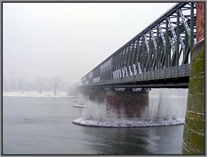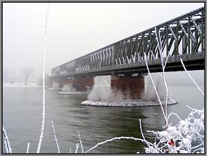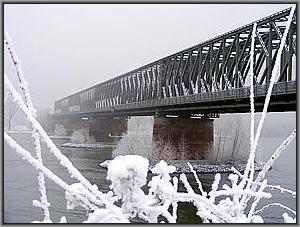 Schnell fließt das Rheinwasser unter der Brücke hindurch, der geringe Frost kann ihm nichts anhaben, während der Rauhreif