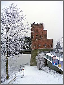 Linksrheinisch führen die Gleise zwischen zwei reizvollen aus rotem Sandstein gemauerten Brückentürmen hindurch,