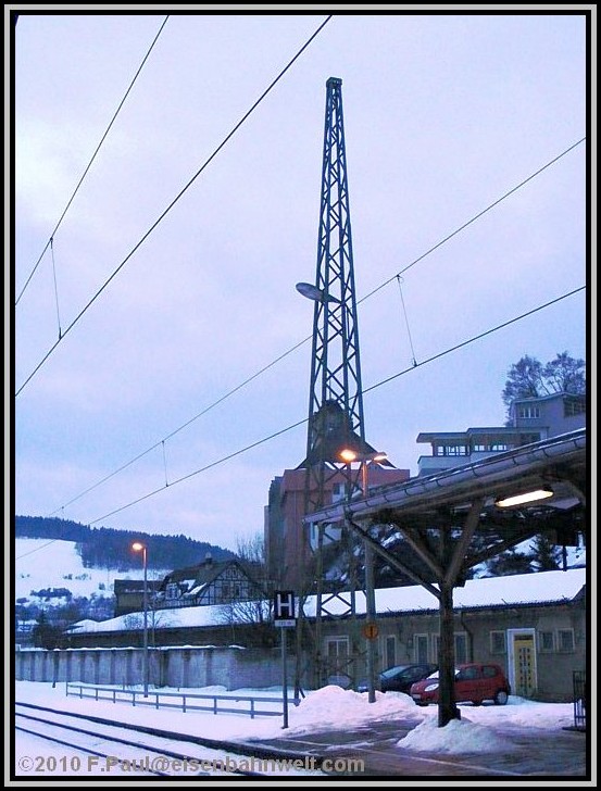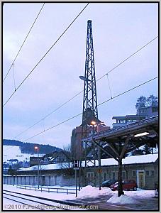 Ein alter bayerischer Oberleitungsmast aus dem jahr 1937/38 reckt sich auch am 04.02.2010 noch neben dem Empfangsgebäude in den Abendhimmel. Die Lampe, als deren Mast er offenbar sein Überleben verdankt, leuchtet längst nicht mehr.... |