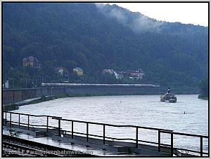 wird nach der Wende flußabwärts in Richtung Pirna schippern. Der Doppelstockzug wird wohl gewinnen! |