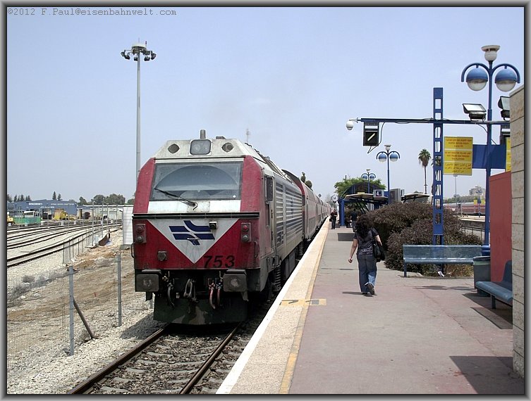 Die Züge aus Ashkelon-Rehovot halten am Bahnsteig 4, so auch am 03.05.2012 die Alstom-Lok Nr.753 mit P 264 nach Binyamina.
