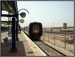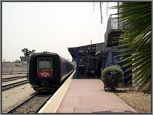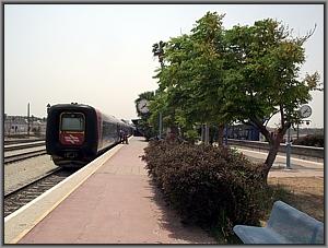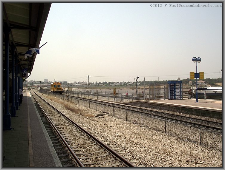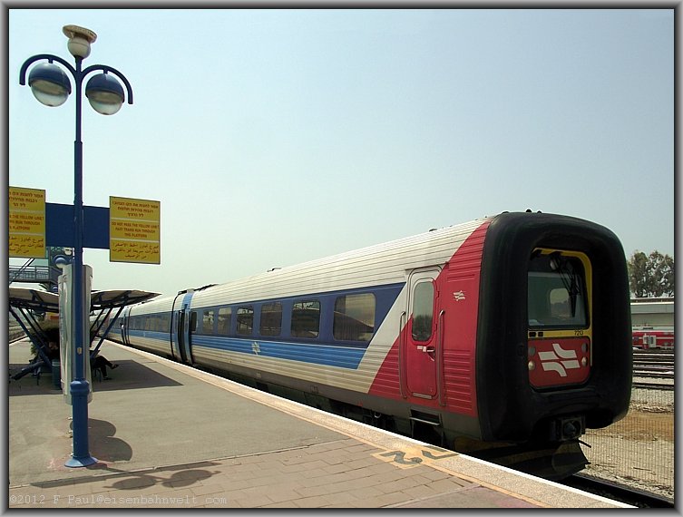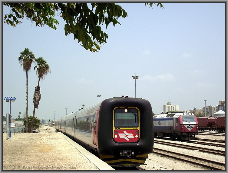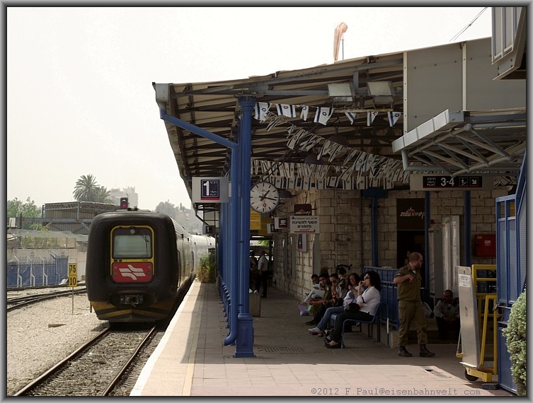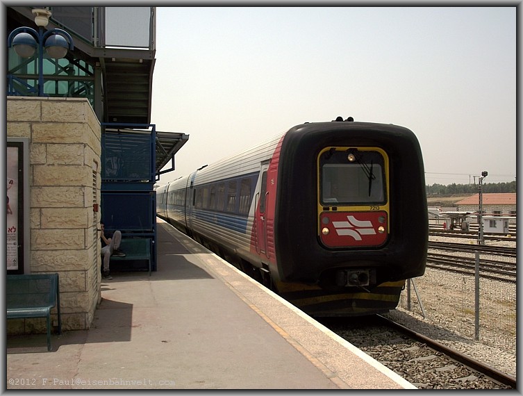Die nächste Gumminase reißt mich aus meinen Gedanken: Der Triebzug 7029 rollt an der Spitze vom Schnellzug 519 (Tel Aviv-Jerusalem) an den Bahnsteig 1. |
