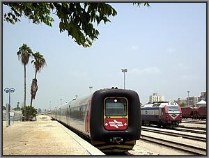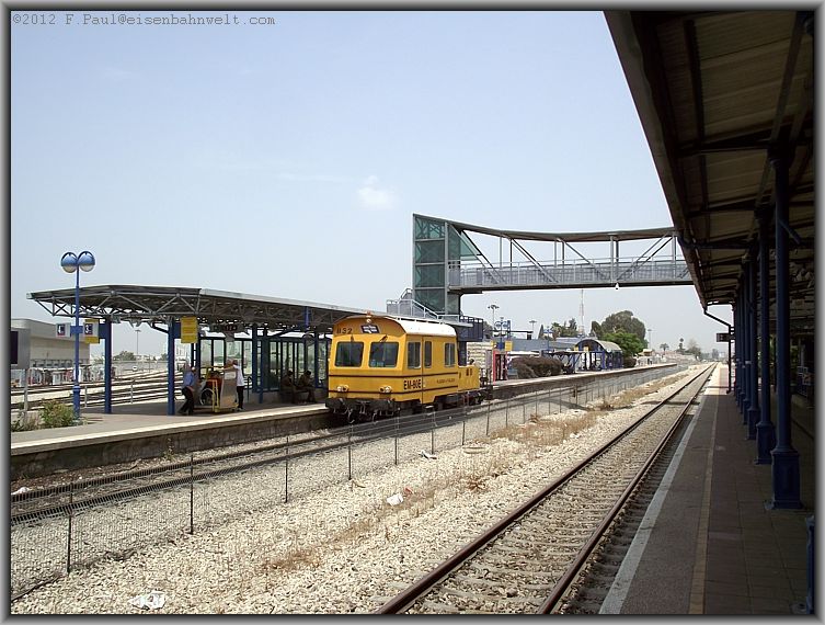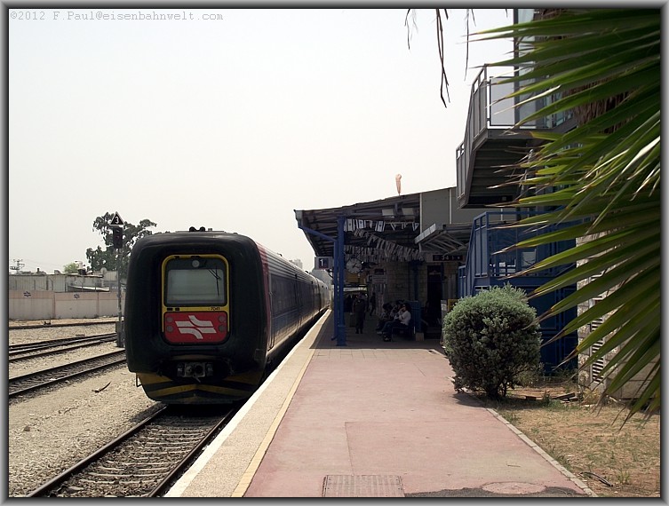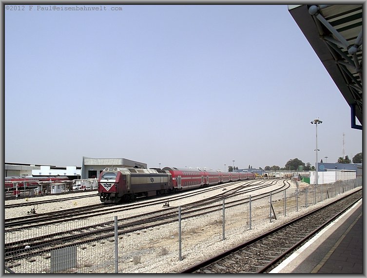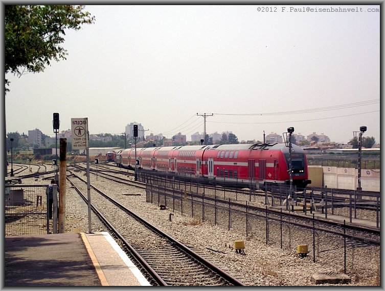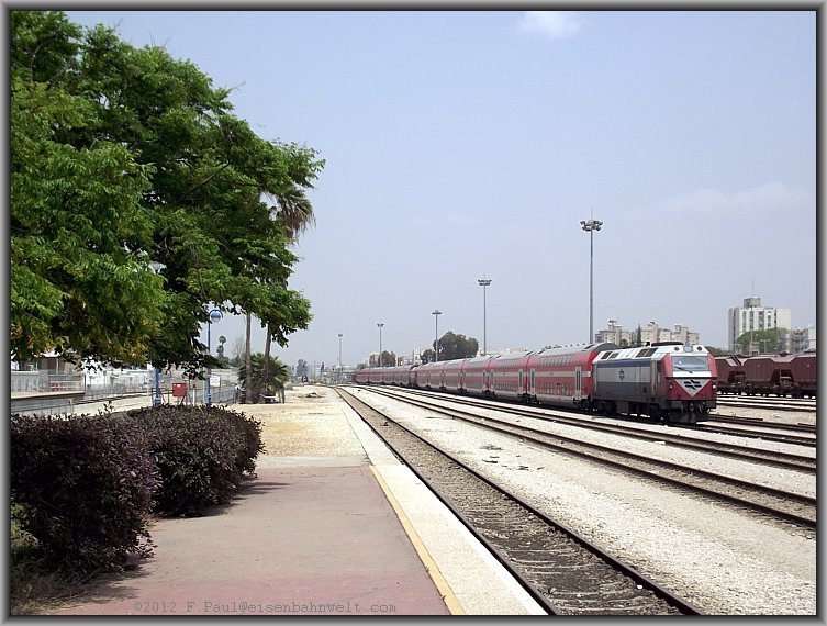 Im Blockabstand zu dem Doppelstockzug aus Ashkelon folgt dann eine Gumminase, der Schnellzug 512 von Jerusalem nach Tel Aviv fährt ein, in Gestalt vom Triebzug 7213. |