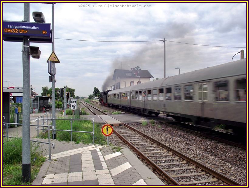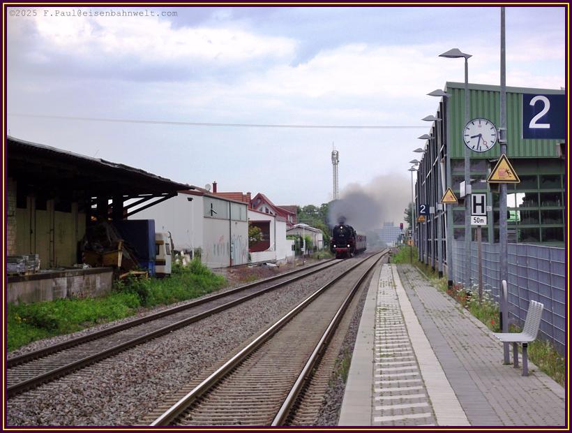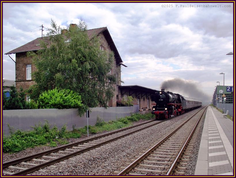und bullert unter wegen der geringen Anhängelast nur mäßiger Dampfentwicklung mit DPE 81096 nach Landau an mir vorbei, die durch die DB redesignete Pacific 01 202, ausgemustert im Bw Hof im Jahr 1973.
