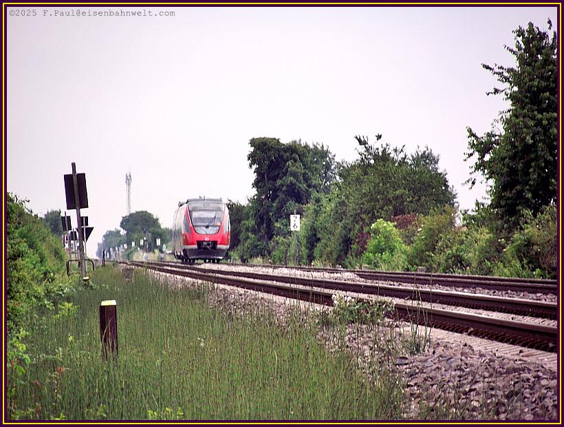 643 014 hat am Nachmittag des 01.06.2016 gerade den Hp Neustadt-Weinstraße Süd verlassen und brummt nun auf der ziemlich geraden Hauptbahn nach Landau seinem nächsten Haltepunkt