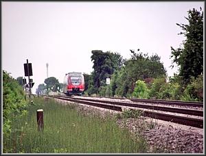 Maikammer-Kirrweiler entgegen. Noch lange ist der recht kurze Triebwagen, immer kleiner werdend, erkennbar, bis er hinter dem Horizont verschwindet. |