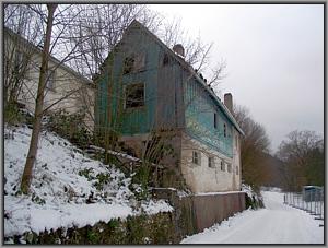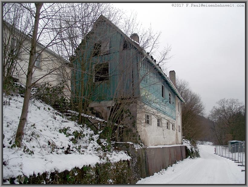 Gleich hinter dem Bahnhof von Wiesthal modert ein altes Werksgebäude vor sich hin. "Sperrholz Goldbach" prangt an der Seitenfront, zumindest