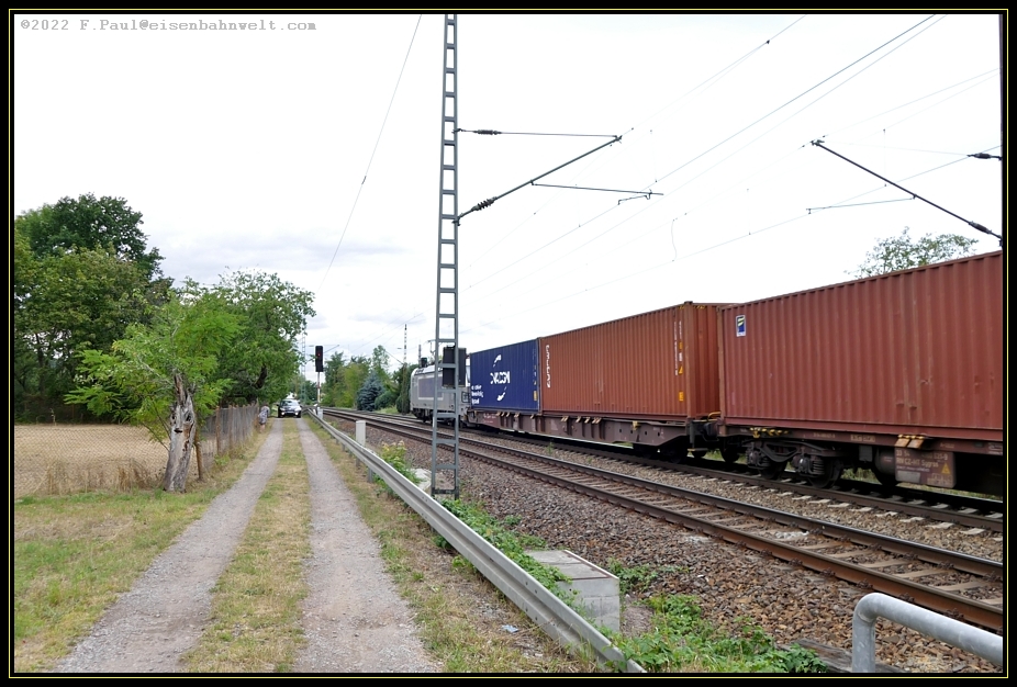 Bimmelnd schließen sich die Halbschranken Bauart WSSB am Hp Dresden Stetzsch am 04.08.2020 und kurz darauf surrt der Metrans-DGS 43312 auf der Fahrt von Praha-Uhrineves