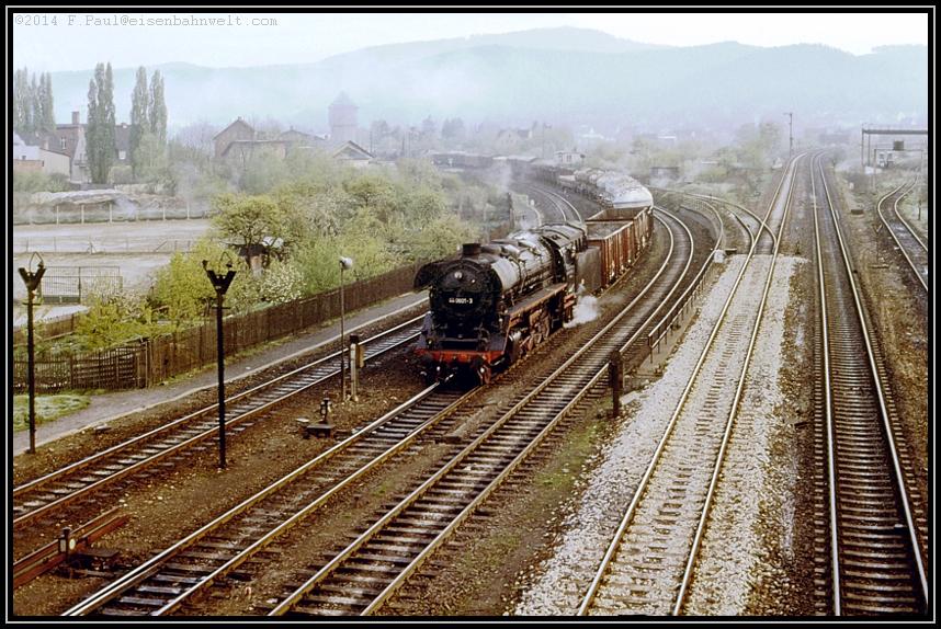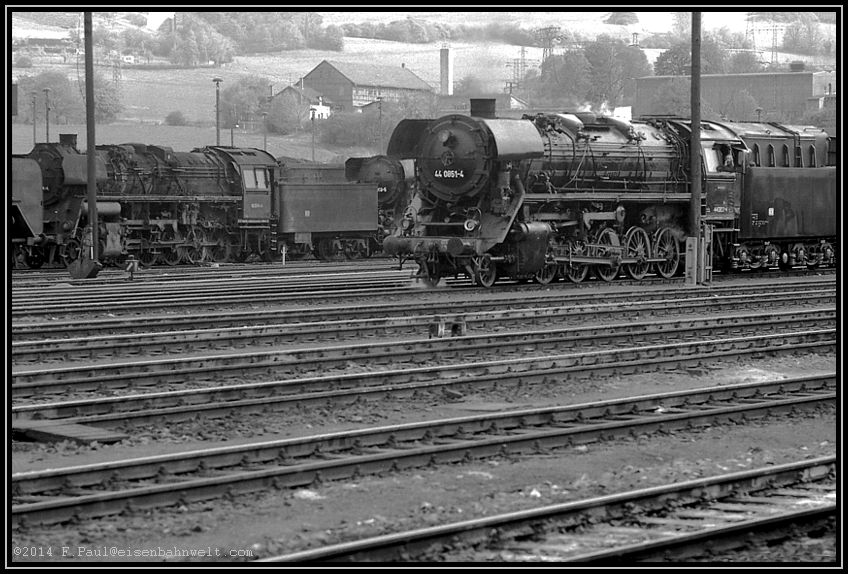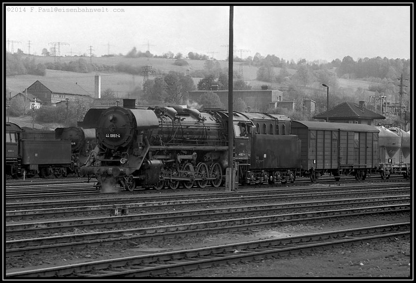 Unter Dampf dagegen 44 0851, welche bald mit ihrem Güterzug in Richtung Camburg ausfahren wird, dahinter die