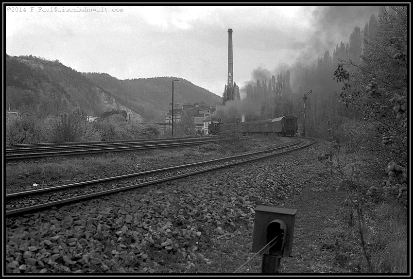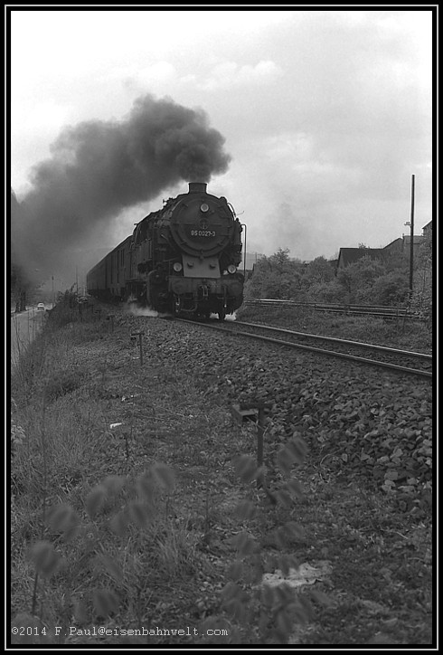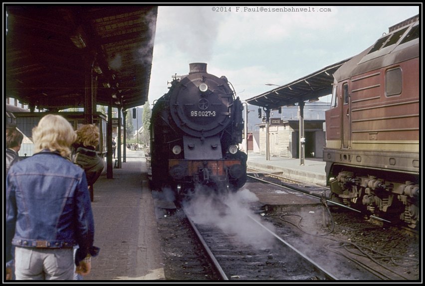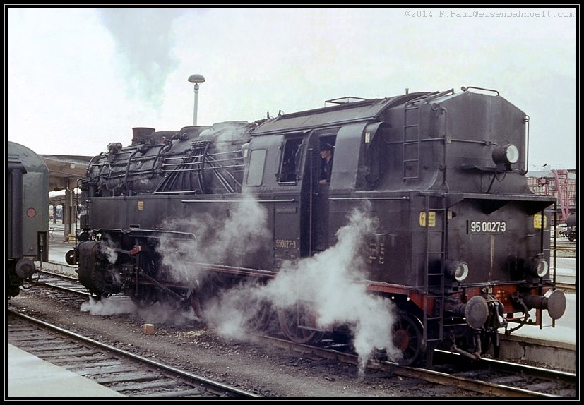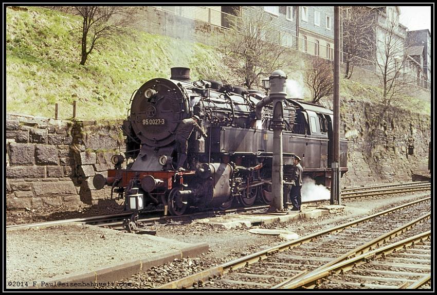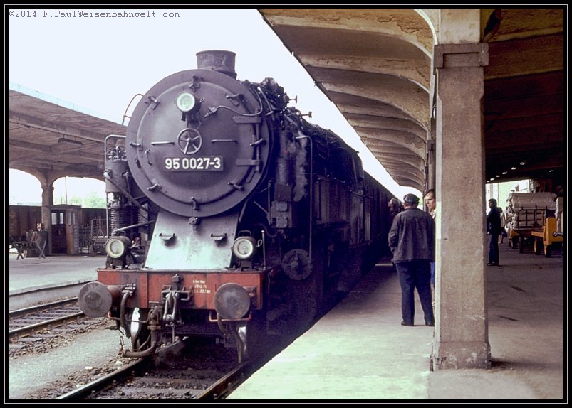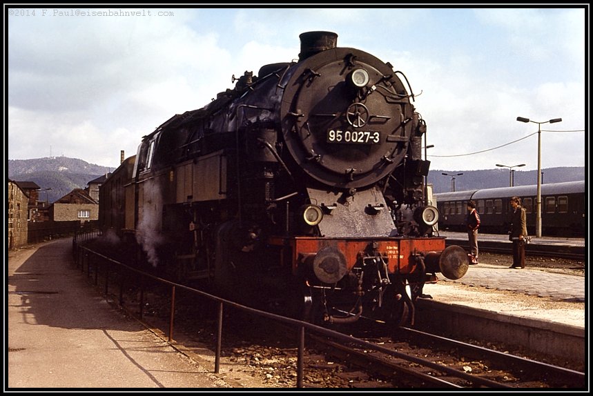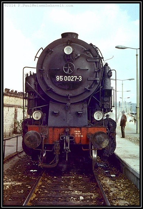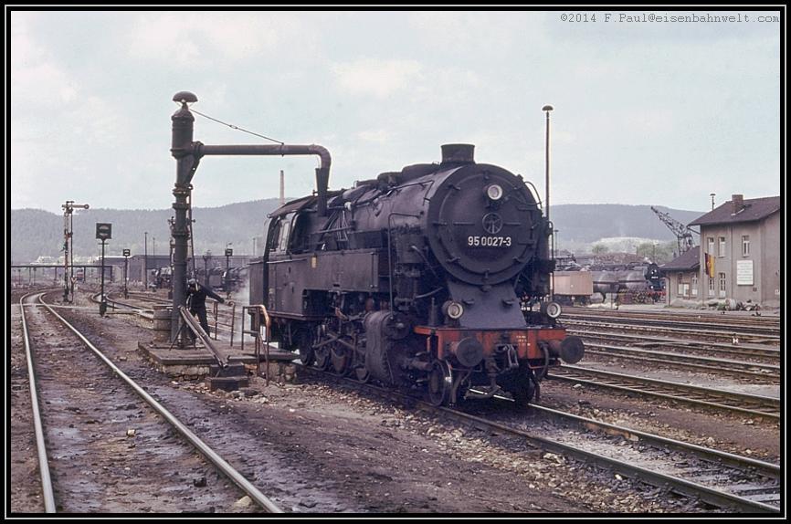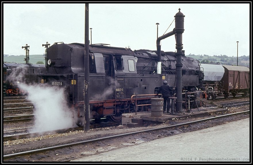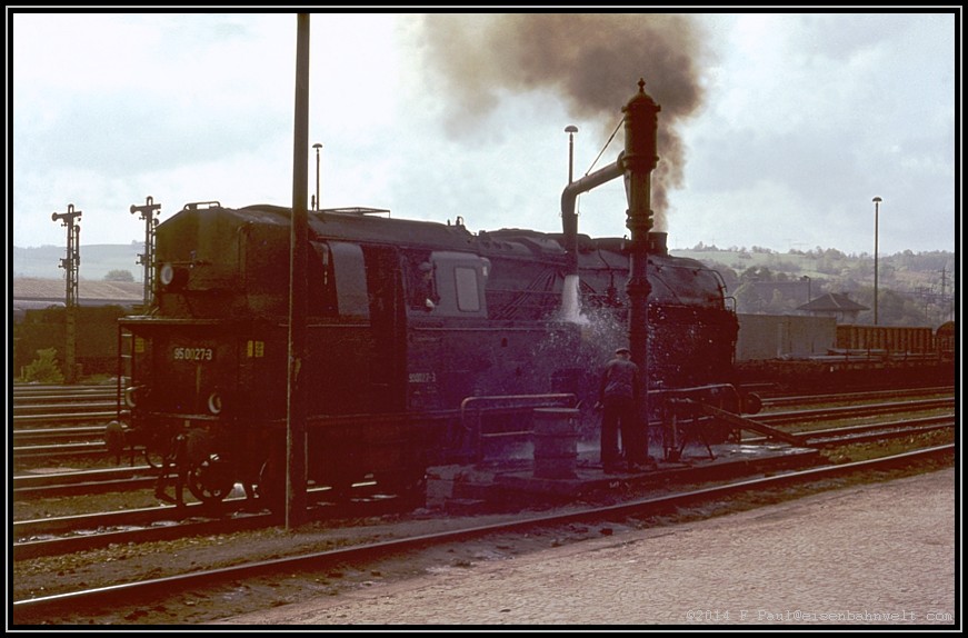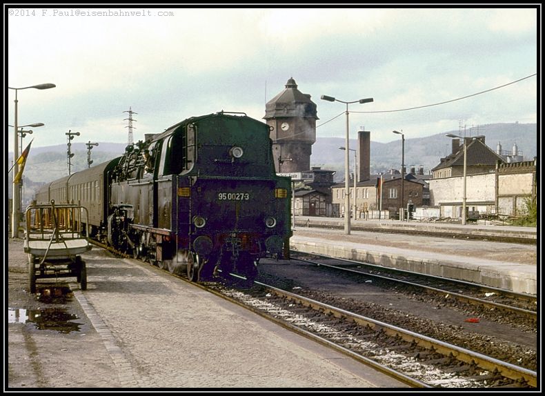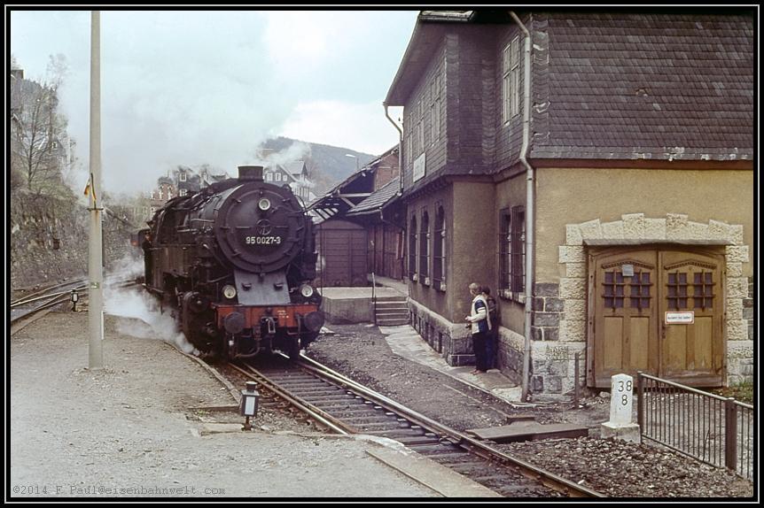 Aber nun zur Bahnhofsausfahrt, denn 95 0027 verläßt mit P 18007 Saalfeld! Erst nur als kleiner Punkt mit Dampffahne