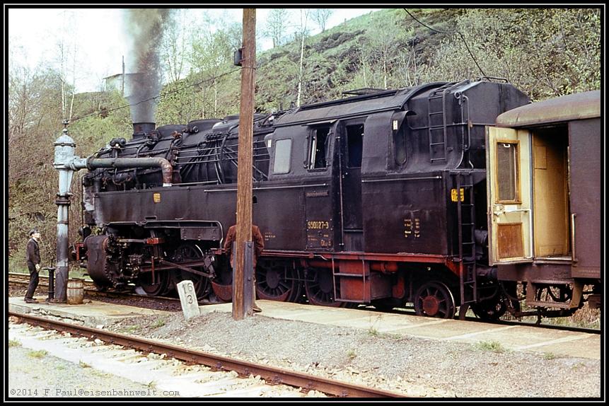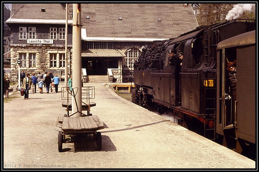 das weiterführende Gleis nach Sonneberg sichtbar ist. Gerade angekommen, muß die Lok den Zug vom Bahnsteig in das Vorfeld drücken,