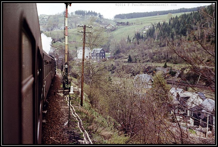 In starkem Gefälle nähert sich der Zug der Spitzkehre von Lauscha, wobei rechts unten schon
