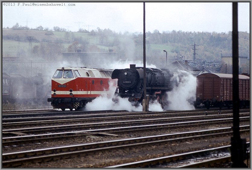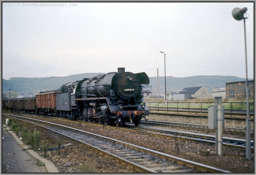 Mein Blick schweift nun zu den Gütergleisen herüber: 44 0414 fährt mit einem Dg oder Ganzzug in Richtung Gera aus, und,