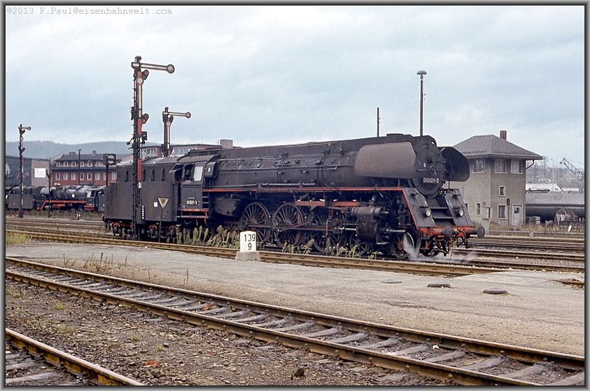 Vom Affenfelsen lasse ich den Blick zuerst gen Süden schweifen: Im Bw sind 01 0521 und 01 0517 vor Massen an abgestellten Dampfloks erkennbar,