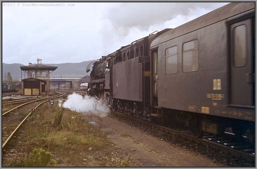 los und wird mich gleich in eine Wolke aus Qualm und Lärm hüllen. Hinten am Lobensteiner Zug ist 110 738 inzwischen abgehängt und der Zugführer hat den Zugschluß für