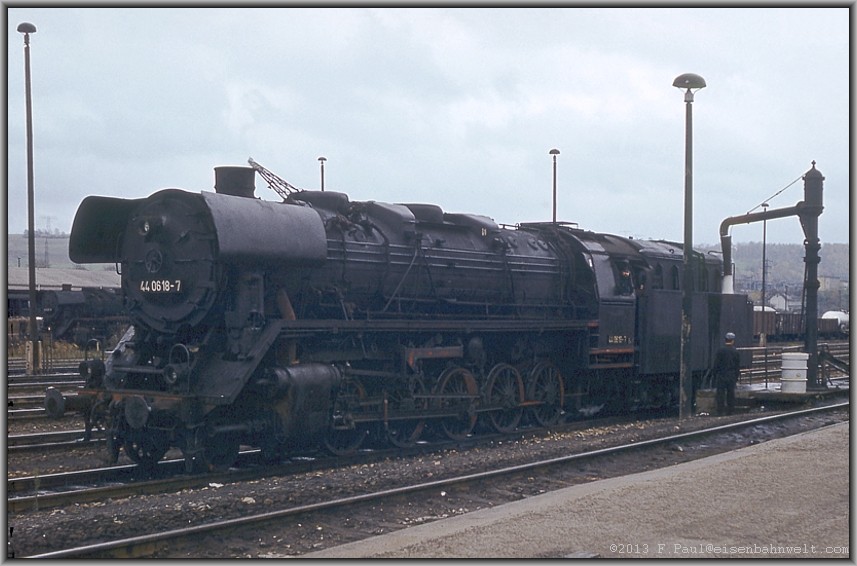 Noch zwei Bilder mache ich: Ein erstes von der am Wasserkran ihren Durst löschenden 44 0618, ein bestimmt tausendmal fotografiertes Motiv,