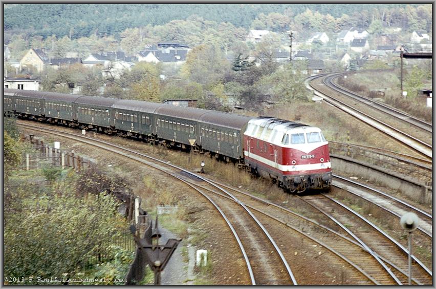 ganz rechts wartet 119 009 immer noch auf ihre Abfahrtszeit. Und von der anderen Seite nähert sich die Leipziger 118 773 mit D 703, dem einzigen Schnellzug, welcher in Camburg