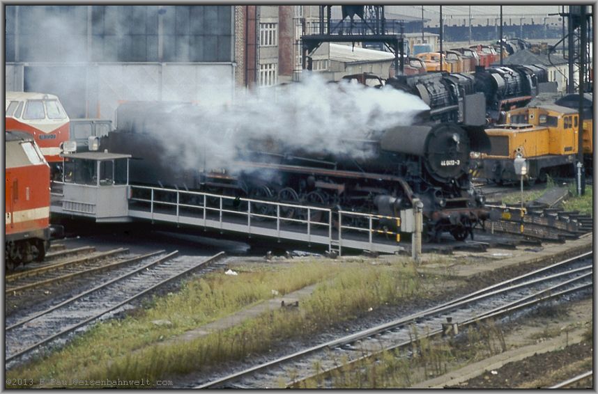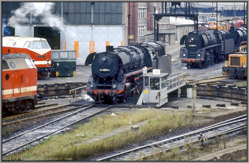Während auf der Saalebahn um 15:30 Uhr 01 0519 mit P 4005 aus Leipzig naht, wird auf der Drehscheibe gerade 44 0851 behandelt.