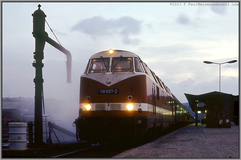 Fahrzeit (für 141,2 km!) eine Zumutung auch für die Reisenden. Aber schön sieht sie im Dämmerlicht aus, die V 180! |