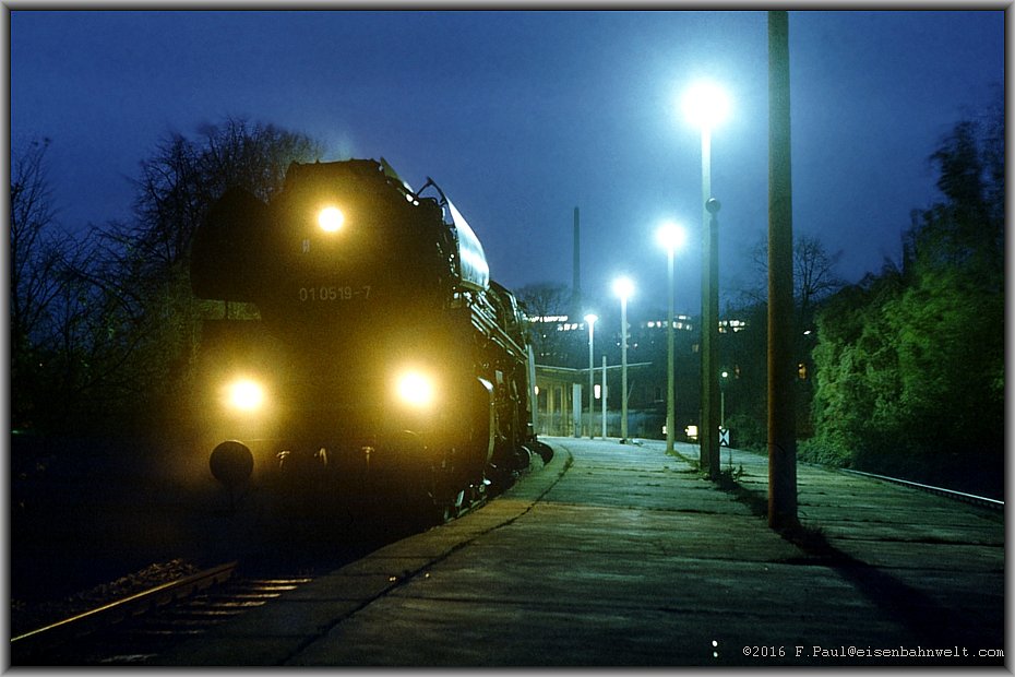Und da rollt auch schon 01 0519, die Saalfelder Starlok, an den Bahnsteig und hält auch genau an der H-Tafel! Die Haltezeit reicht gerade