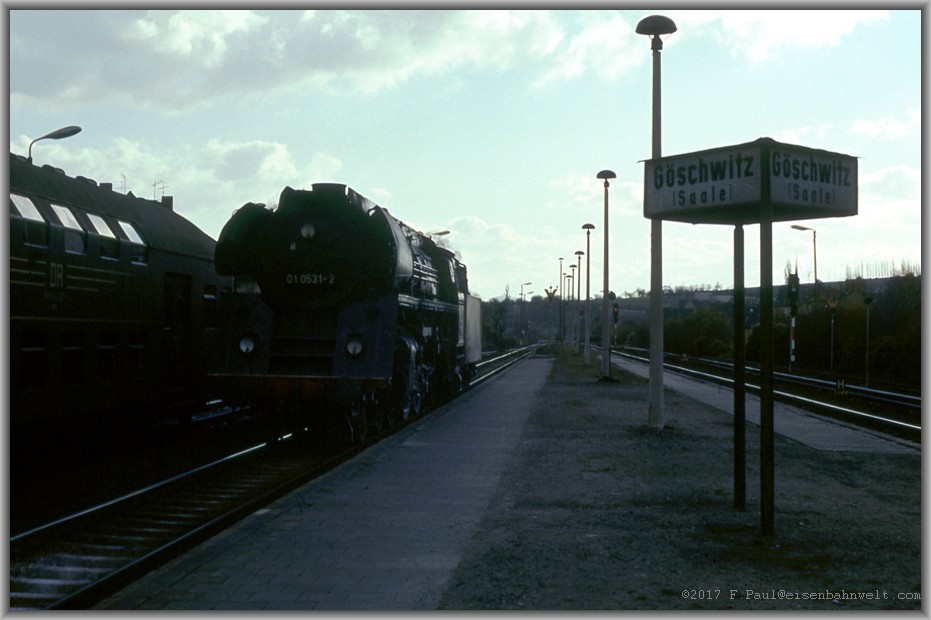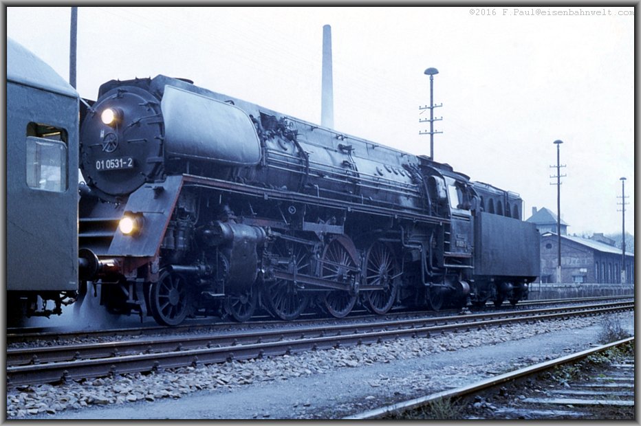 nicht.... Ich erreiche mein Ziel, als 01 0531 mit P 5019 und "Tender voran" aus Jena Saalbahnhof eintrifft und sich eine Wolke ernsthaft über das Saaletal legt. |
