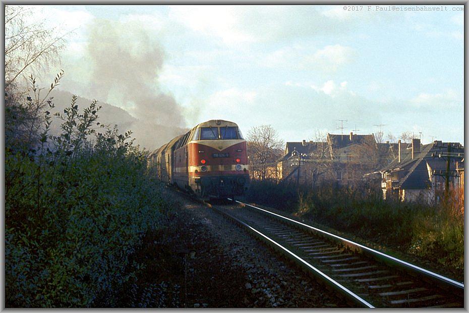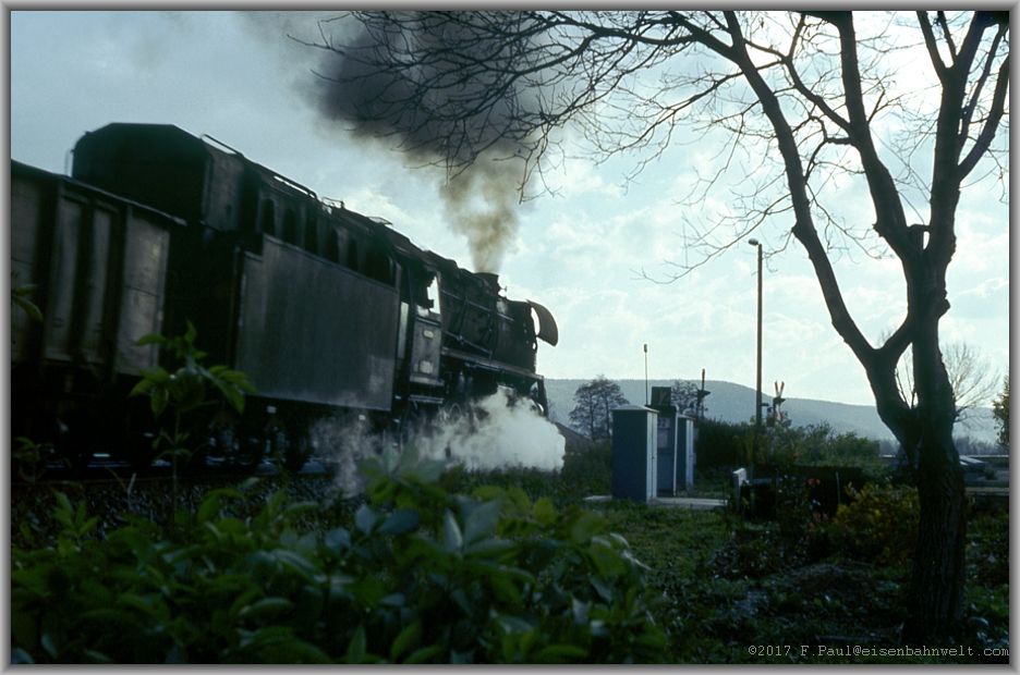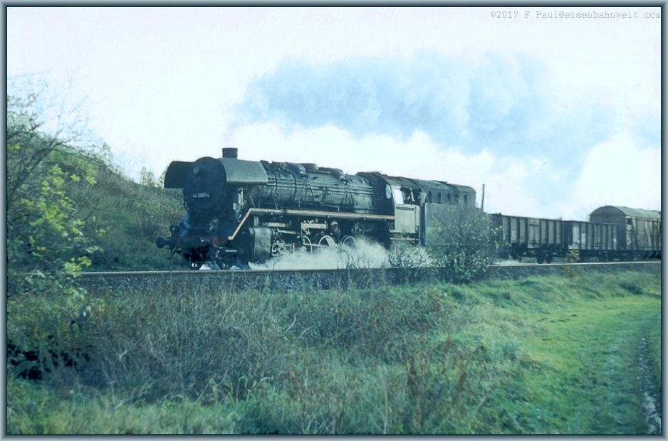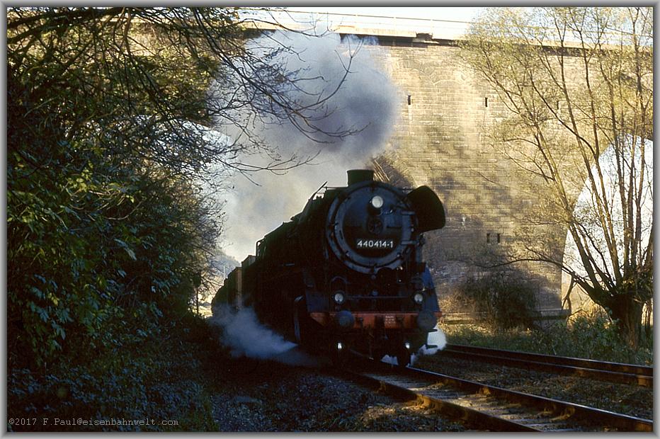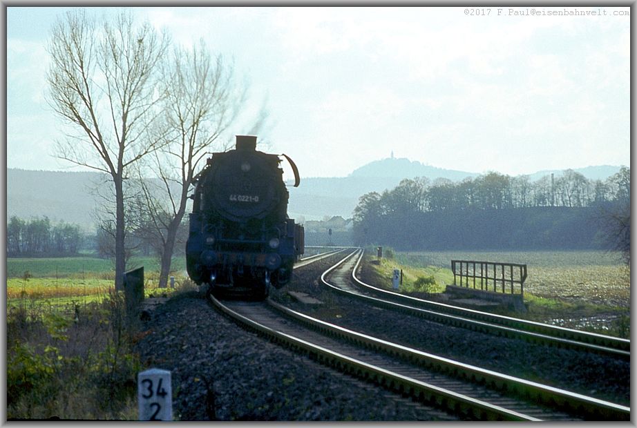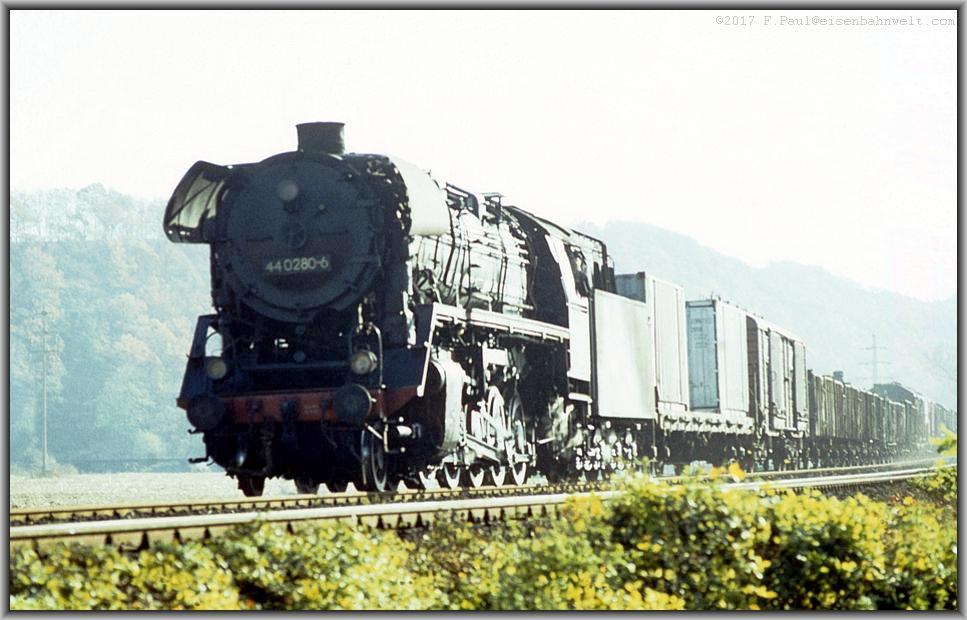 nähert sich von Rothenstein her ein schwerer Güterzug mit 44 0280. Das Gegenlicht hebt das markante Aussehen der Lok noch hervor! |