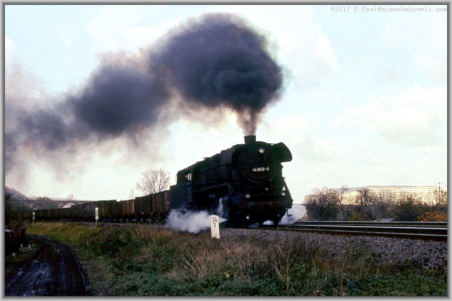 Nun aber zurück nach Göschwitz. In Höhe der Autobahnbrücke dampft mir 44 0414 in voller Fahrt mit dem voll ausgelasteten Dg 55445 aus Weißenfels