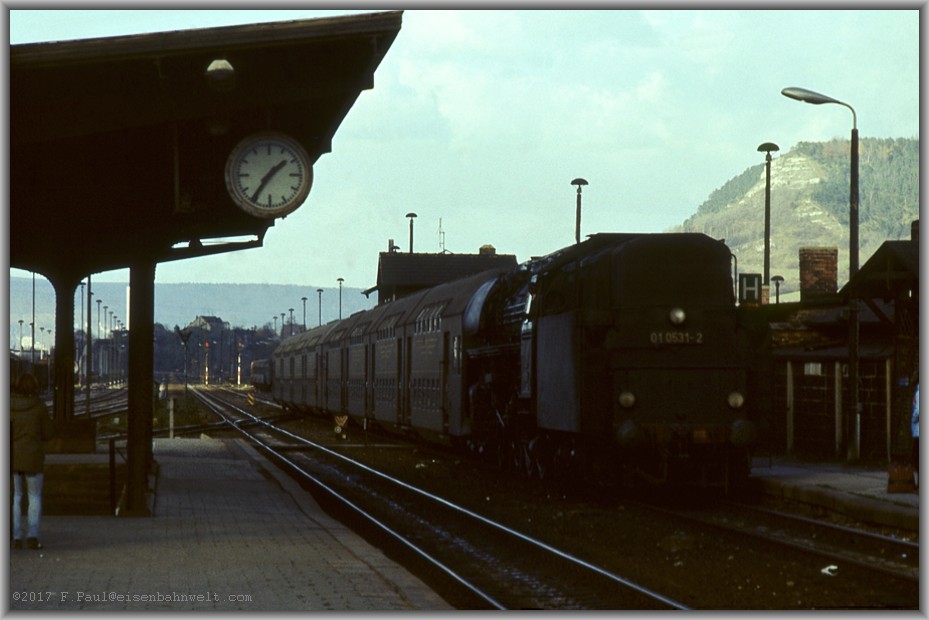 für ein Bild... Nun schnell den Berg hinauf zum Westbahnhof, dort fährt gerade 01 0531 mit dem Berufszug P 5010 aus Saalfeld ein. Schnell verlassen die Pendler