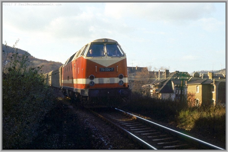 Schnellen Schrittes gelange ich an den Südkopf des Bahnhofs Göschwitz, als die frisch in Betrieb genommene 119 075 mit dem verspäteten D 501