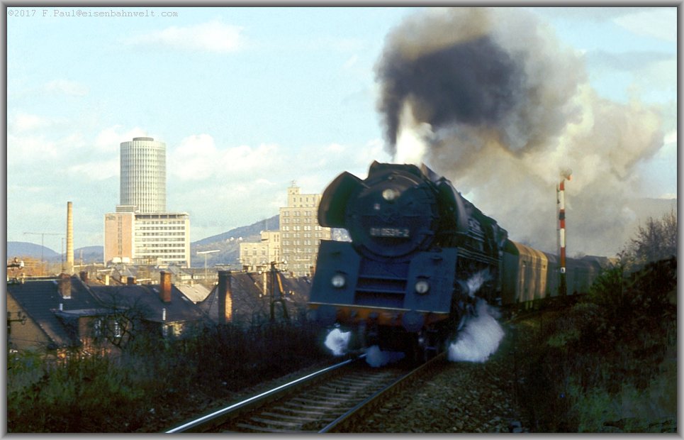 die Einfahrt von 119 034 mit dem Gegenzug P 6019 aus Erfurt fest, ehe dann 01 0531 über den Hochhäusern von Jena mit ihrem langen Personenzug aus der Kurve auftaucht
