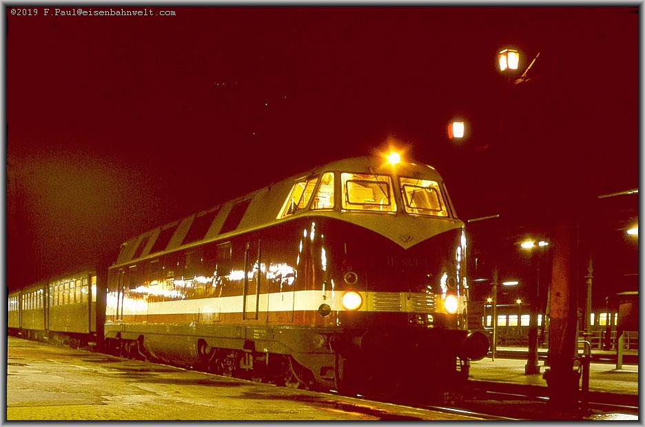 eignen. So sind vom derweil nach Gleis 3 einfahrenden D 443 aus Köln nur Streifen auszumachen. Als der Schnellzug dann zum Stehen gekommen ist, betrachten die Reisenden aus der BRD interessiert