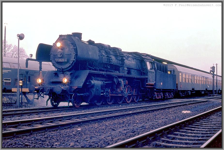 "Dampfer" allemal, auch oder gerade in der Dämmerung und auch, weil es eben eine BR 41 ist! Nicht umsonst trägt diese Baureihe den Spitznamen "Mikado"! Und auch vom Nachbarbahnsteig 2/3 macht die Lok