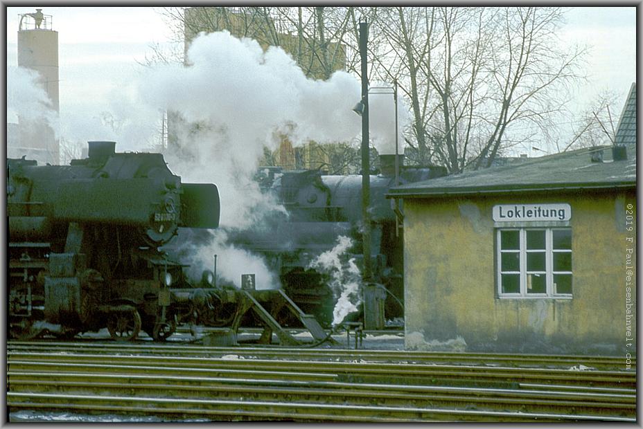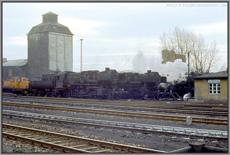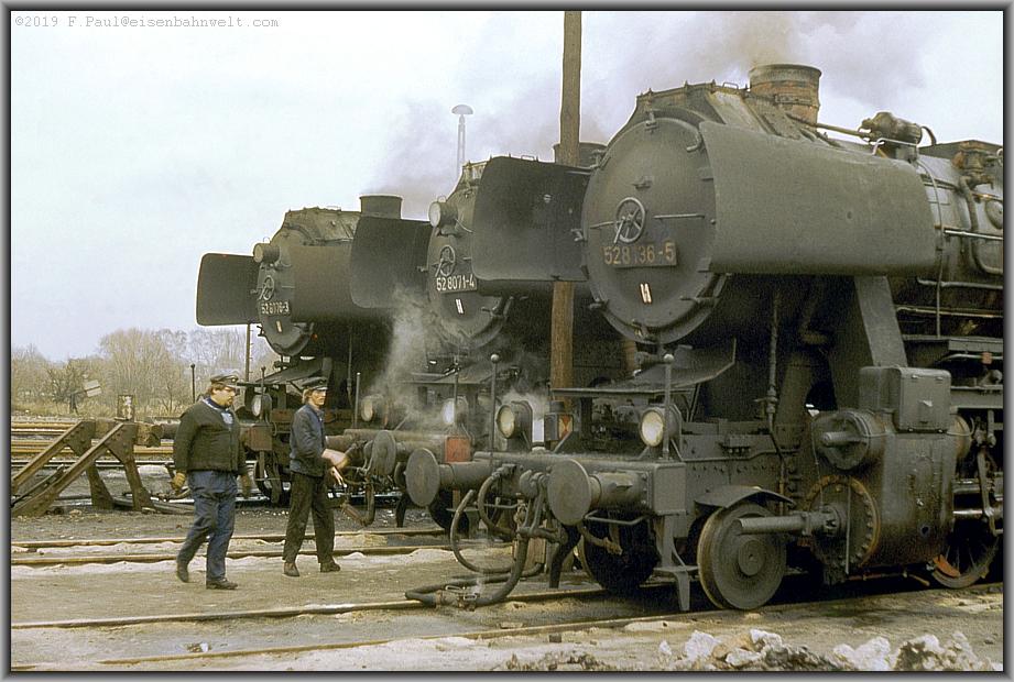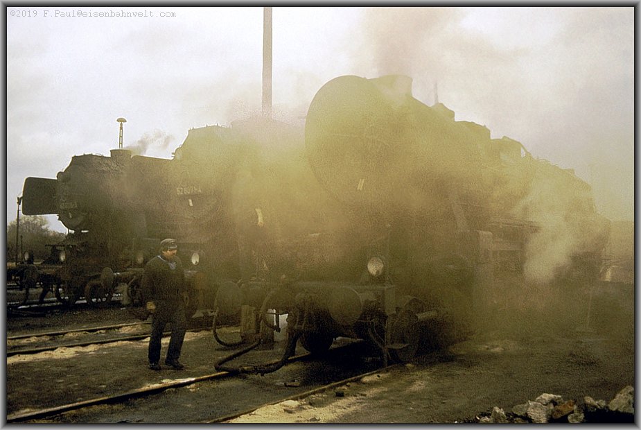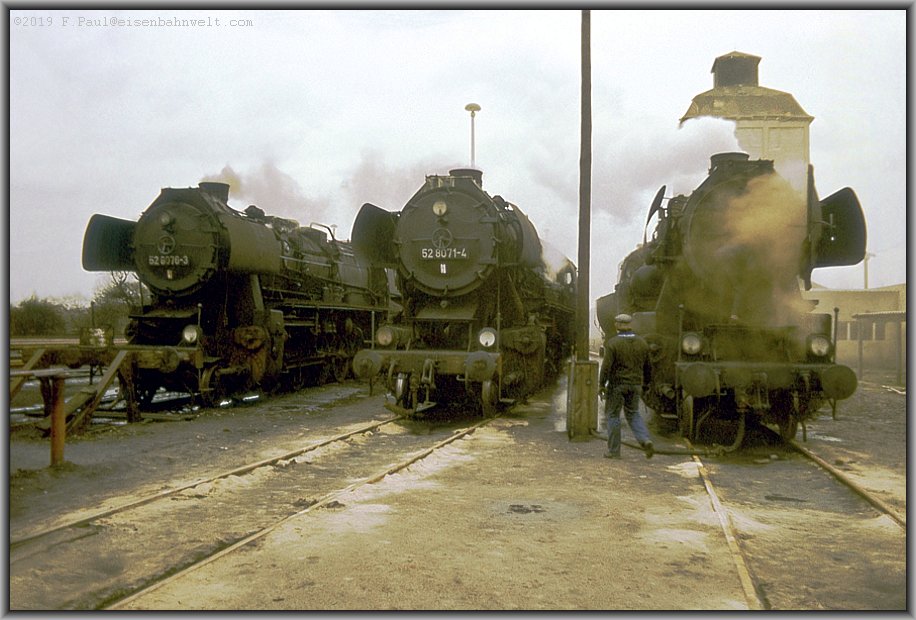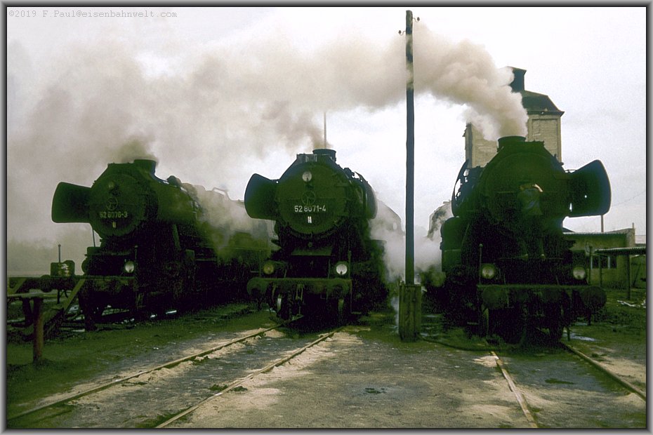 Die umfangreichen Bw-Anlagen nehme ich vorerst nur von der Bahnsteigseite in Augenschein: Zuvorderst qualmt da 52 8076 vor sich hin, unterstützt dahinter von 52 8071