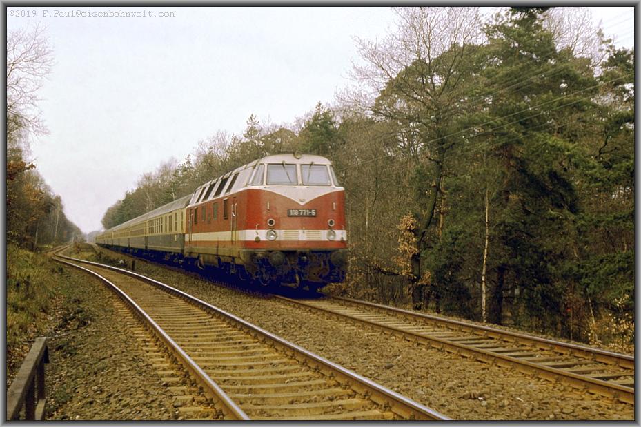 Halt in Haldensleben. 118 771 brummt mit einer langen Schlange von DB-Wagen heran, mit D 447 (Köln-Leipzig), links das Gleis der Nebenbahn von Weferlingen / Dönstedt, welches früher hier