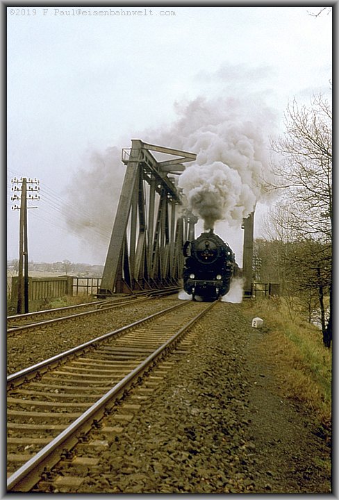 an die damals zweigleisige Strecke mit einer Weiche angebunden war und heute separat über den zweiten Trog der Brücke geführt wird. Platz für 52 8173, welche kurz darauf mit Ng 63734 zu den Dönstedter
