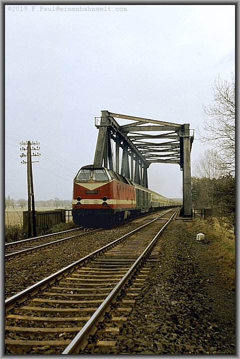 Leipzig-Köln, bespannt mit 119 008, auf dem Hauptgleis Richtung Oebisfelde über die Brücke. Und im Blockabstand folgt ein Fcs-Leerzug nach Flechtingen zu einem weiteren Steinbruch,