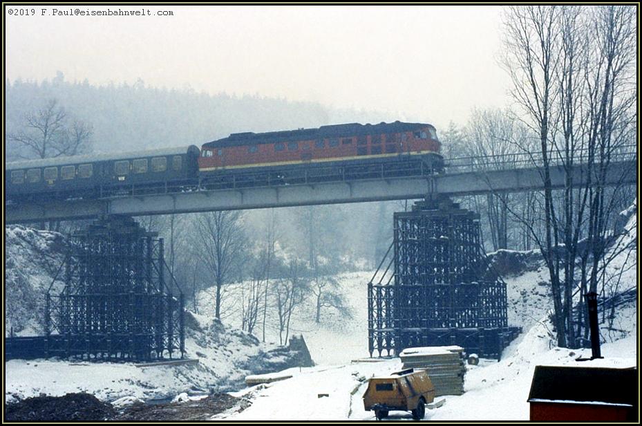 (Karl-Marx-Stadt-Düsseldorf) über die Brücke. Ihren Pfeilern ist der Aufwand anzusehen, welcher erforderlich war, um sie sicher auf der abschüssigen Talsohle zu verankern. |