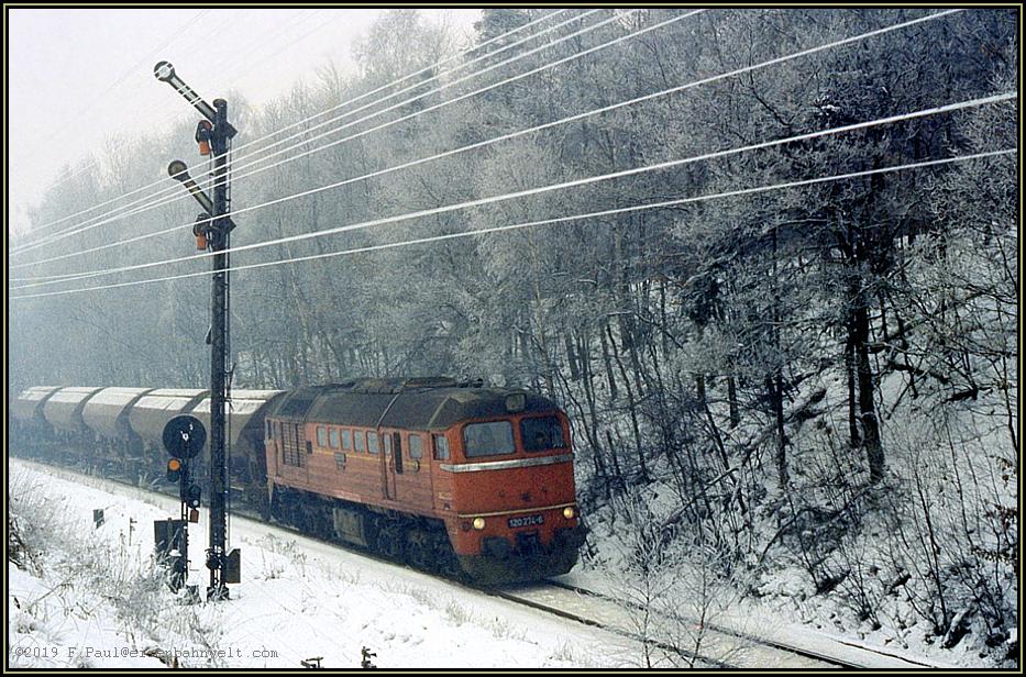 und kurz darauf 120 274 die Fotostelle mit mäßiger Geschwindigkeit passiert (Bild oben rechts). Aber dann mischt sich in das Rumpeln der Güterwagen der immer stärker werdende