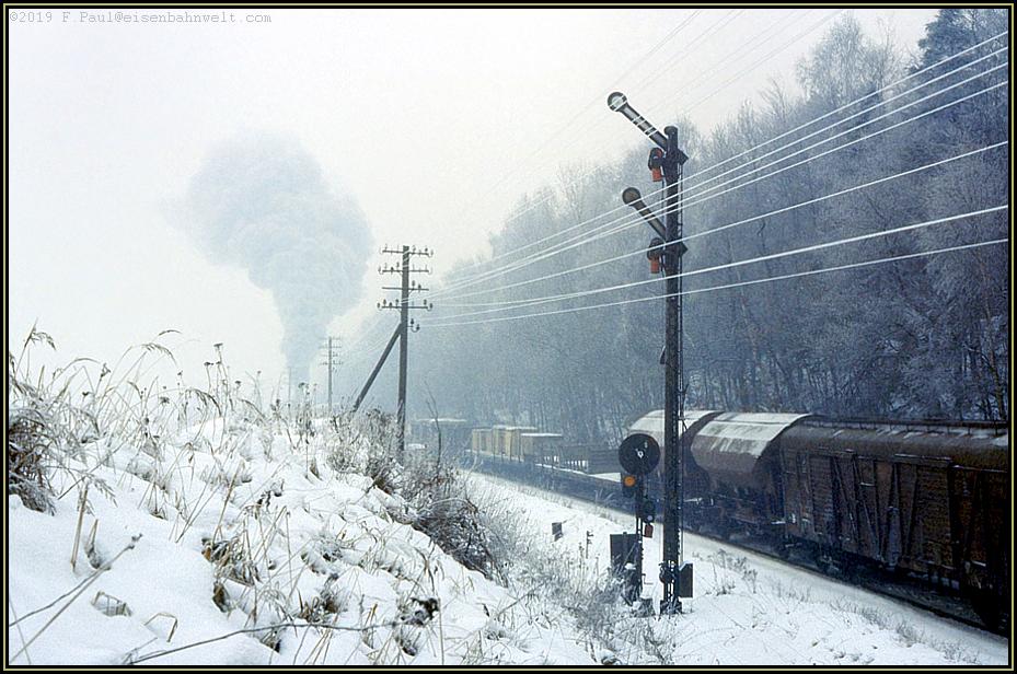 Da: Ein Pfiff des Zugführers, das Abfahrsignal erteilt, und mit voller Füllung, leicht schleudernd, geht es am gezogenen Blocksignal der Ausweichanschlußstelle vorbei.