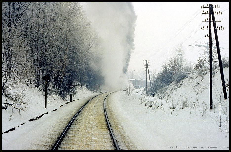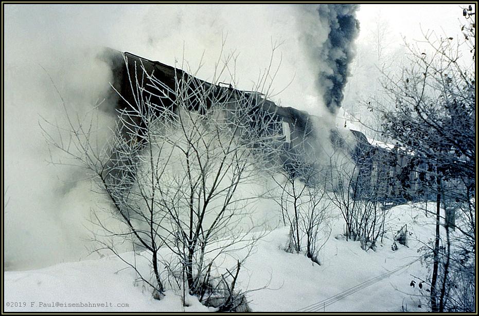 Was für ein Genuß für Augen und Ohren.......! Unendlich langsam entfernt sich die Lok hinter dem mit Rauhreif behafteten Gestrüpp.