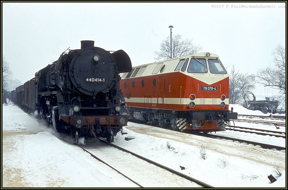 Auf Weiterfahrt in der Gegenrichtung wartet dagegen 119 078. Einen Monat später werden die Dieselloks den Verkehr auf dieser Strecke von den Dampfern vollständig übernommen haben.