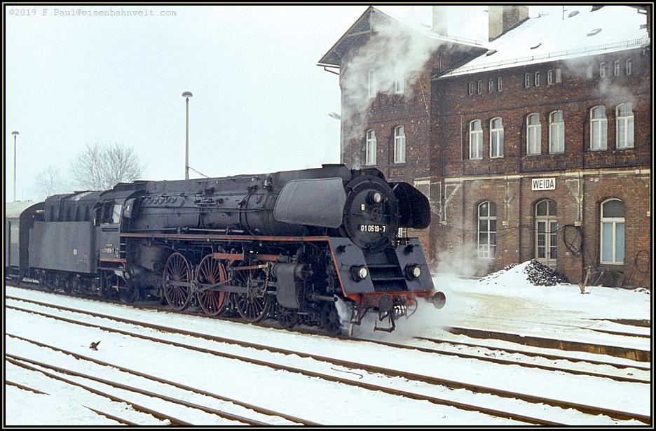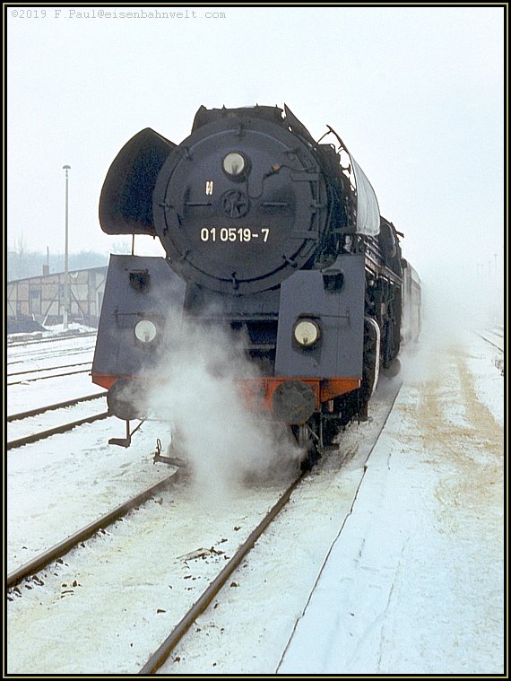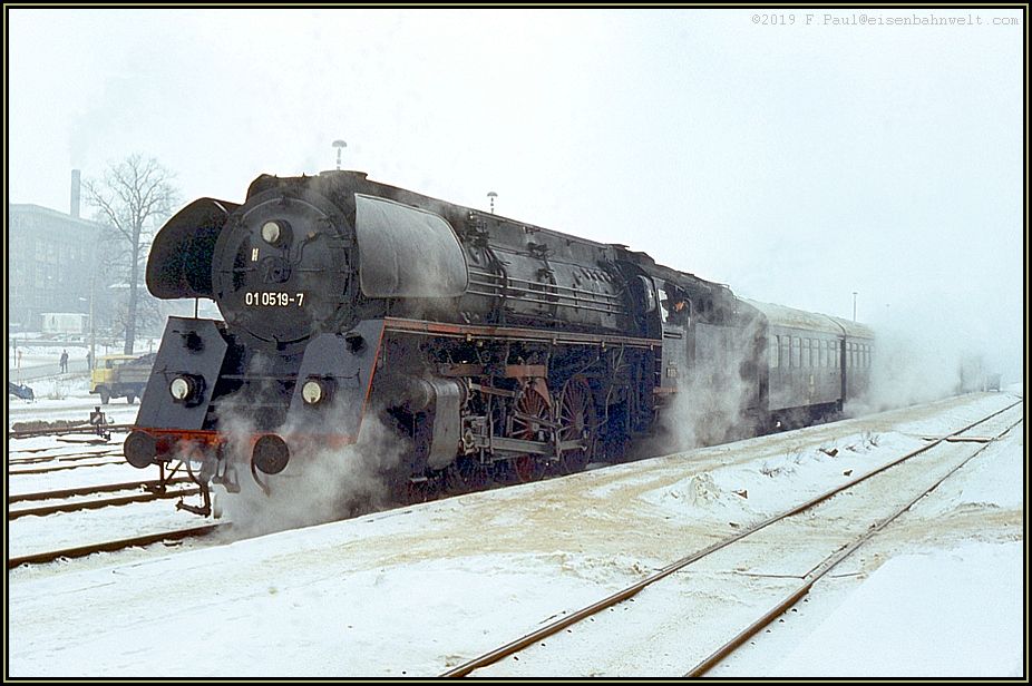 Mit reichlich 30 Minuten Verspätung hat 01 0519 schließlich auf der Fahrt von Leipzig nach Saalfeld den Bahnhof erreicht. Ein Gepäckkarren ist den holprigen