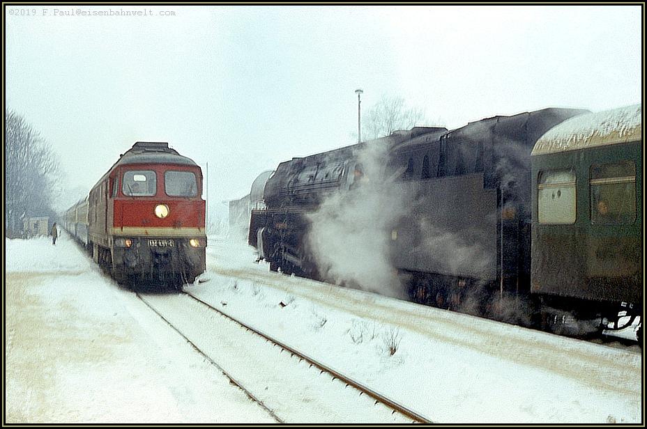 Friedlich zum Zwecke der Wagenheizung dampfend pausiert die Lok vor dem großzügigen, aber etwas heruntergekommenen, Empfangsgebäude mit dem DDR-typischen Kohlenberg