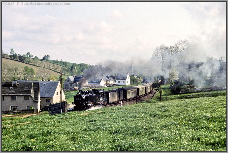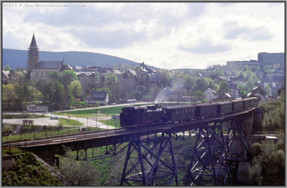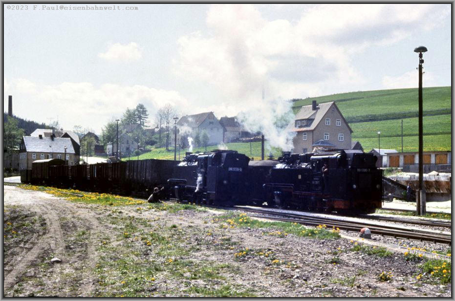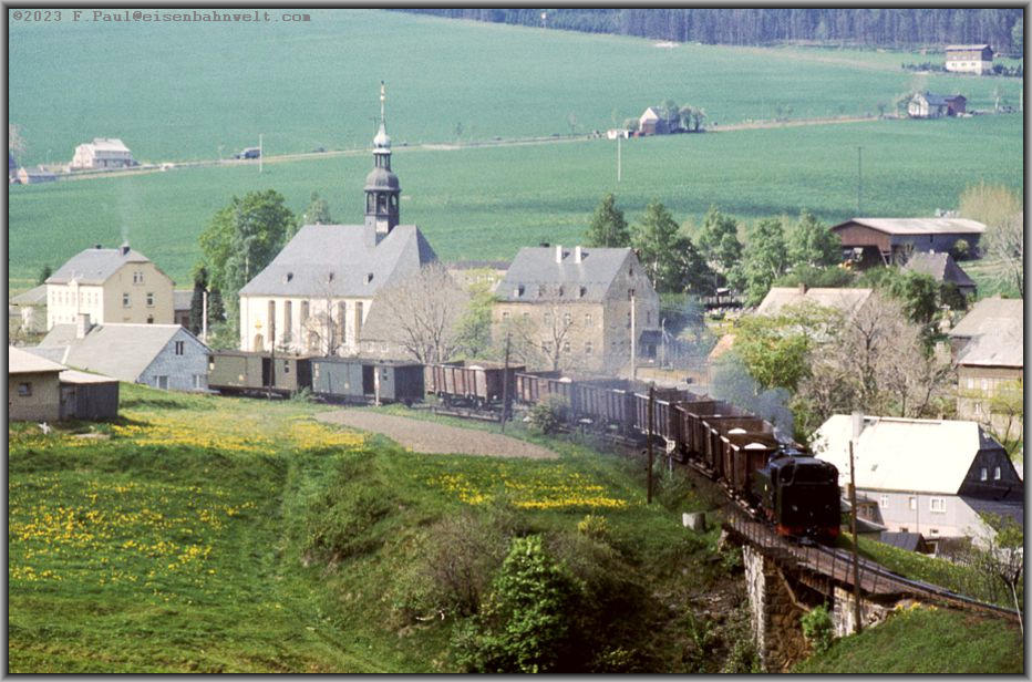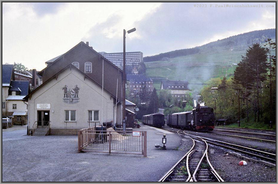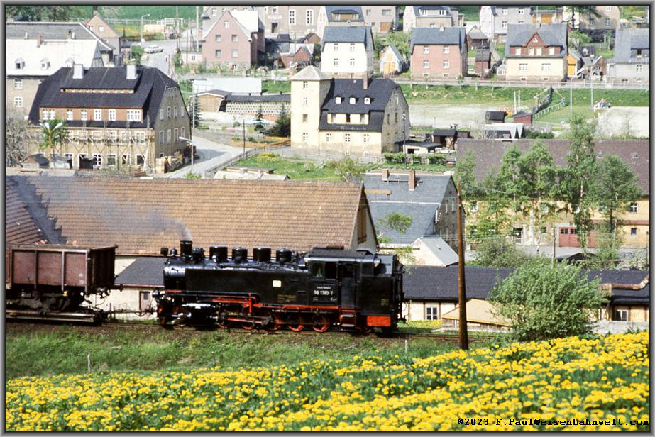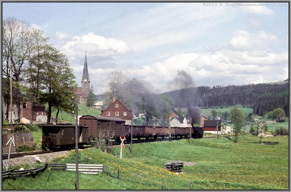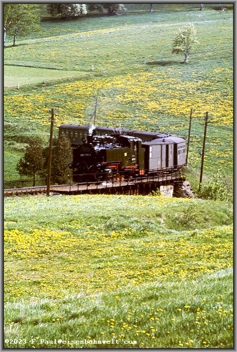 Im Mai 1983 weilte ich mit meiner Familie im Erzgebirge nahe Johanngeorgenstadt, mitten im Wald. Aber irgendwie fehlte mir da der Bahnanschluß. Auch das Wetter war schön, die Wiesen waren mit bunten Blumen übersät. Ich faßte den Entschluß, die Schmalspurbahn Cranzahl-Oberwiesenthal zu besuchen. Da die Bahnverbindungen "aus dem Wald" nach Cranzahl nicht so berauschend sind und ich am Morgen in Cranzahl eintreffen wollte, mußte ich wohl oder übel früh aufstehen..... Am Morgen des 19.05.1983 verlasse ich gegen 04:00 Uhr in der Dämmerung die Übernachtung. Eine Morgenwanderung durch Steinbach und das Steinbachtal bringt mich nach Erlabrunn. Die Sonne geht langsam über den Bergen auf, als ich dort in P 9654 einsteige. Wer denkt schon daran, für eine lumpige 110'er ein Bild zu verschwenden...? In Schwarzenberg gilt es, in P 5691 umzusteigen, der mich über den Markersbacher Viadukt nach Annaberg-Buchholz bringt. Die Fahrt über diesen Viadukt verschlafe ich allerdings.... Noch eine kurze Fahrt mit P 18747, und ich bin in Cranzahl. |
